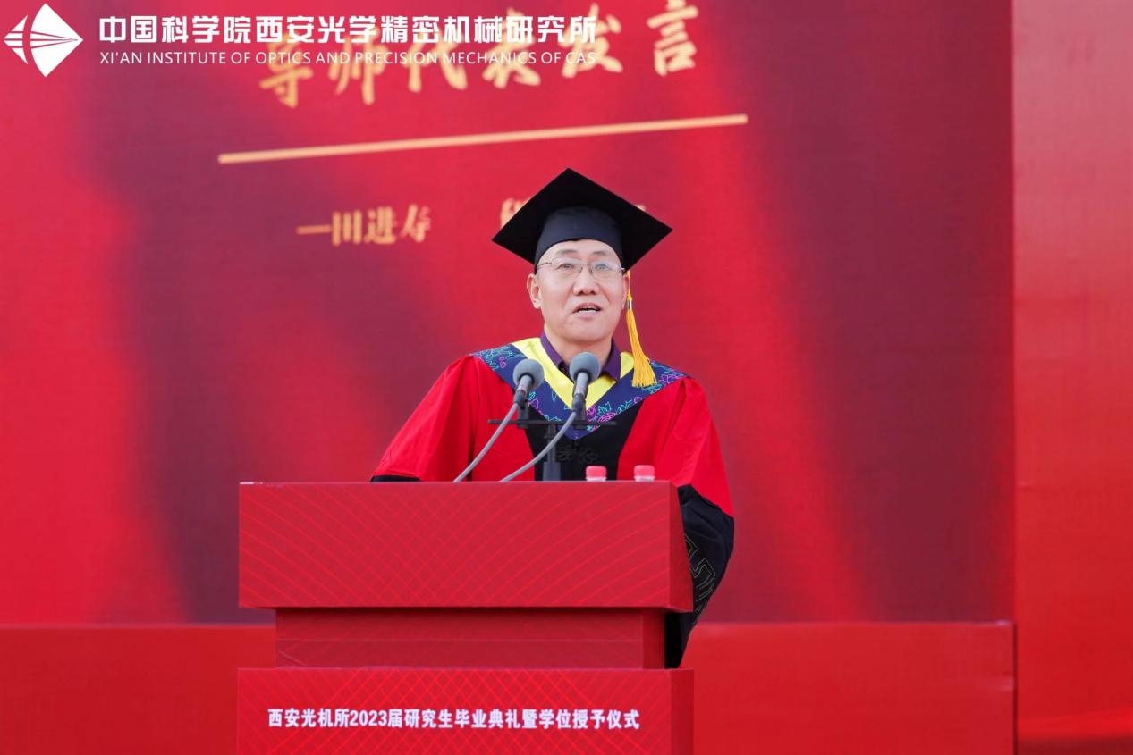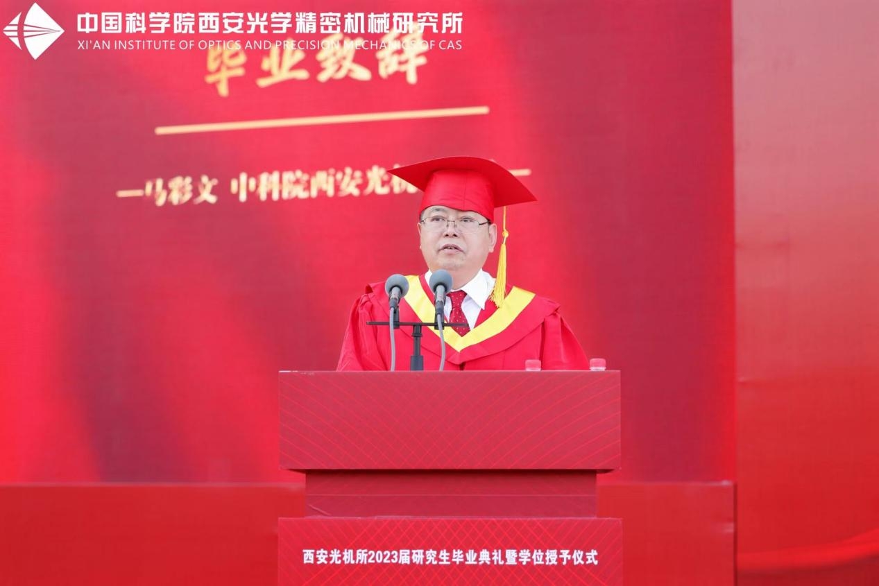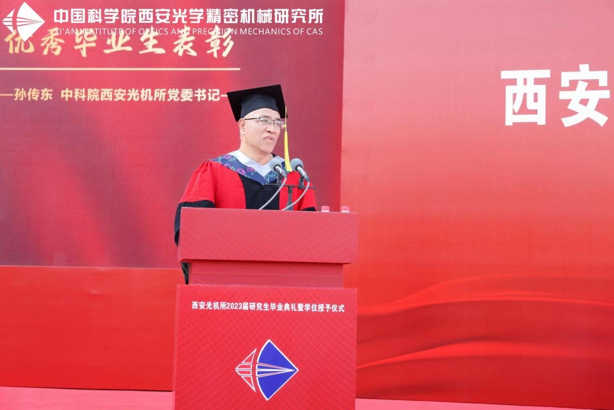 典礼现场,西安光机所党委书记、副所长孙传东宣读了《关于表彰2023届优秀毕业生的决定》,并为获奖毕业生颁发荣誉证书。在随后的发言中,他鼓励毕业生树牢报国志向,培养苦干实干精神,增强创新创造意识,以更加昂扬的状态、更加务实的作风,谱写新时代最壮美的青春之歌。