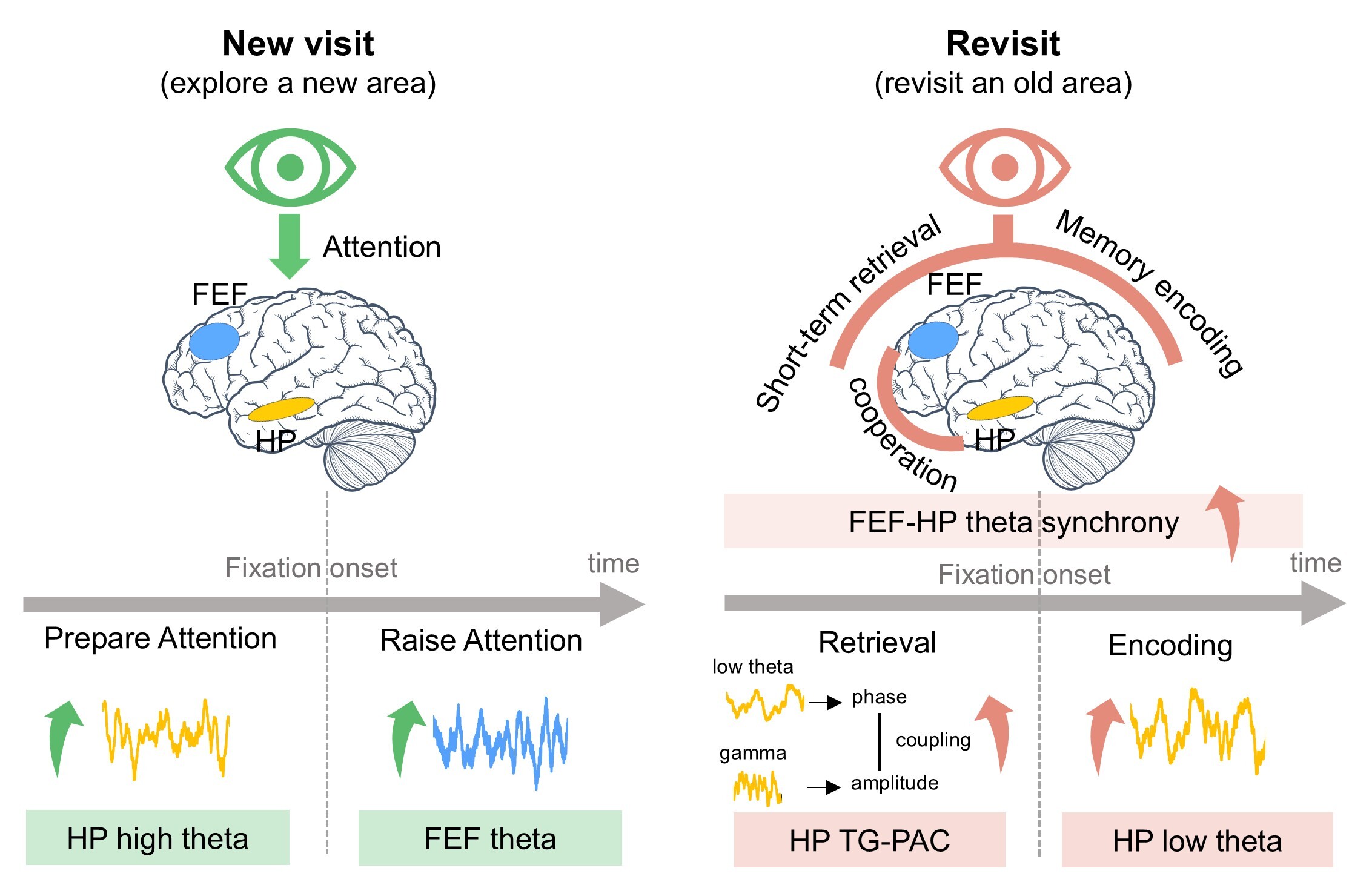 图:探索(左列)和回访(右列)行为背后的注意力与记忆系统分工协作机制